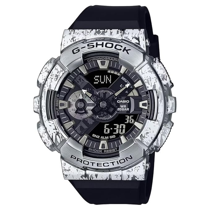 Make a no-statement fashion statement with a G-SHOCK inspired by grunge rock. Inspired by the fashions that grew out of the thrifting and music culture of the ’90s, the metal bezel is specially processed to create a pattern that evokes peeling metal, for a singularly grunge look.
