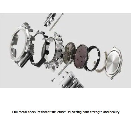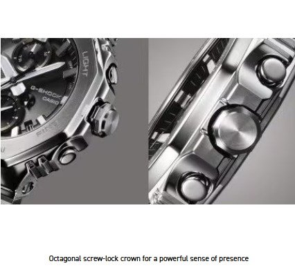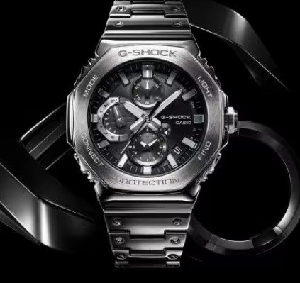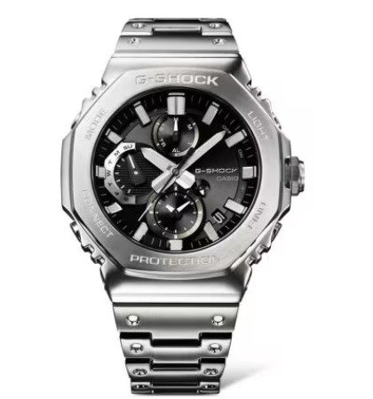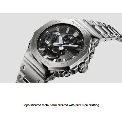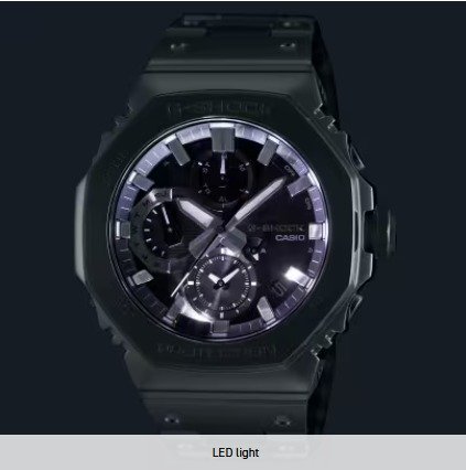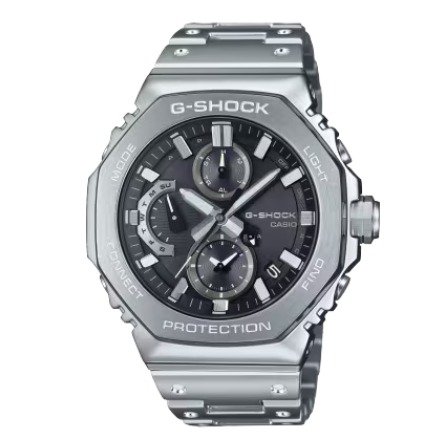 Introducing the full-metal chronograph addition to the continually evolving 2100 line of timepieces which inherit the legacy of the first-ever G-SHOCK, the DW-5000C. We take it way back with the octagonal bezel and dimpled band design of the original from 1983, but all done in metal with stainless-steel case, bezel, and band. Buffering components made of fine resin are installed between the bezel and the case for a shock-resistant structure with a full-metal exterior. The bezel — formed three-dimensionally in a time-consuming forging, cutting, and polishing process — is finished beautifully with a circular hairline treatment on the top surface and mirror polish on the slopes. The delicate molding and vapor deposition of Casio ultra-precision processing technologies add sophistication and quality to the indexes and inset dial rings. The screw-lock crown is designed in the same octagonal shape as the bezel for a more compact case with no sacrifice in outstanding G-SHOCK shock resistance. High-density mounting keeps the module slim, while still providing the advanced functions you love in a compact profile and comfortable fit. Pairs with a smartphone via Bluetooth®. Simply tap into the dedicated app for precision timekeeping that keeps you on track. With Tough Solar, a high-brightness LED light, and a range of other convenient functions, this is a timepiece that delivers both superior style and practical utility.